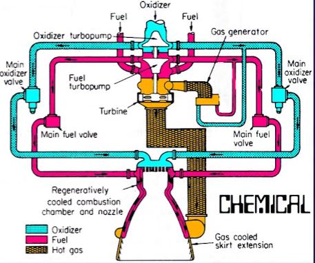 It works by basically combining in equal or adequate amount a propellant or fuel – usually hydrogen, hot pink pipes with an oxidant that is a combustion booster, which is basically liquid oxygen, light blue pipes. The hot gas parts in the yellow scheme are mostly the cooling system for the outlet pipe system or else it will melt.