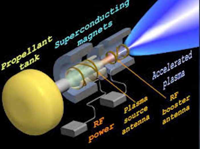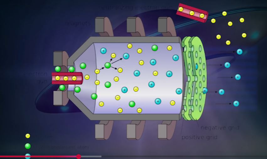 Where the unidirectional focused output of electrons by its charge differential with the rare part of the motor creates an action reaction effect. These engines are still in development, but they waste time since the output power will always be limited. The best ionic impulse motors on Earth right now, more than anything in the JPL under development, are large very expensive